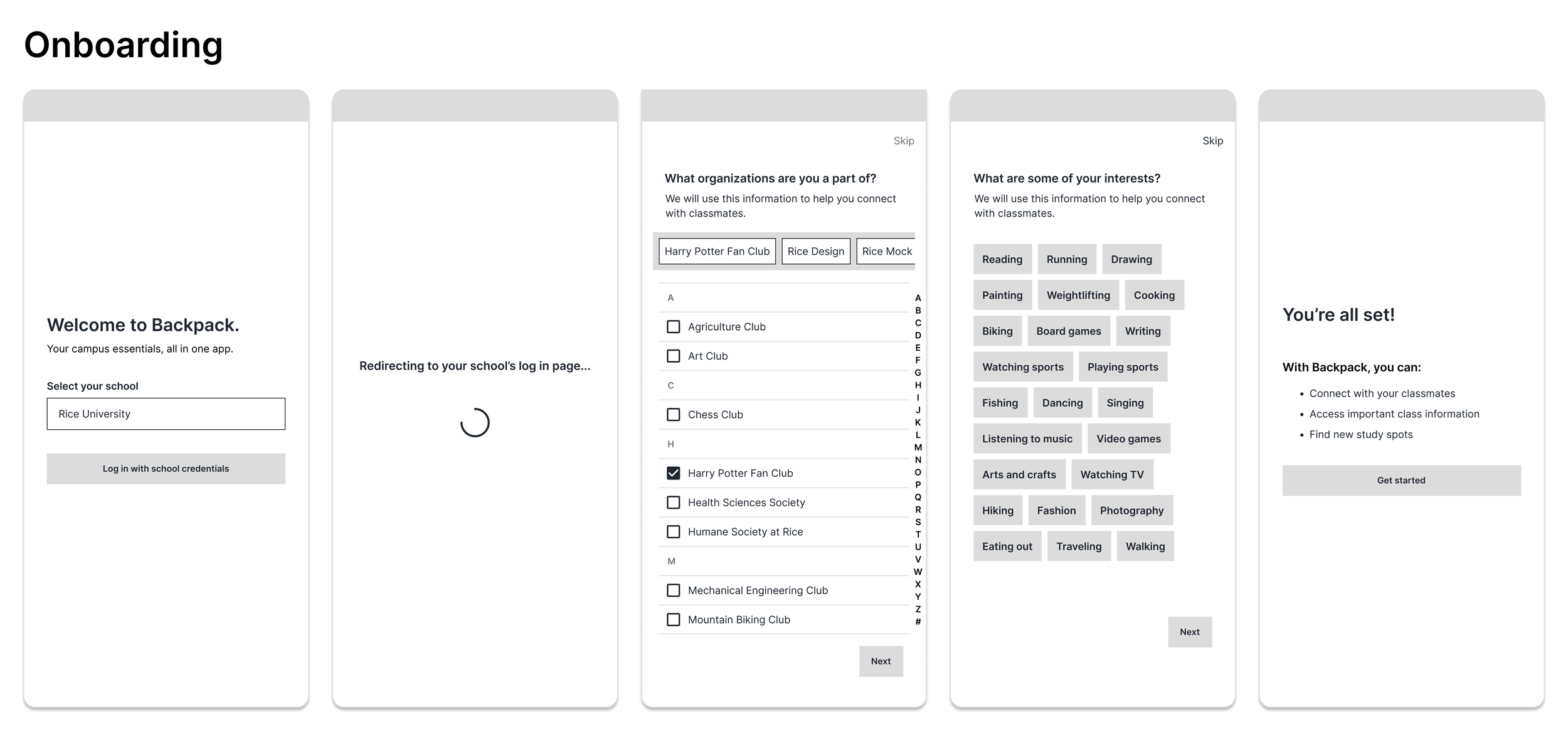 From these findings, I decided to make it easy for users to find students they were likely to get along with. I created an onboarding process where users can quickly select their school organizations, work style, and interests.